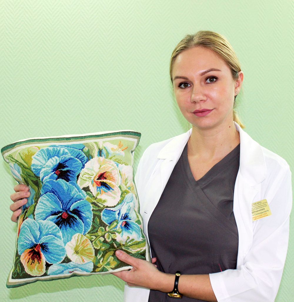 Самую красивую благодарность от пациентки, которая к тому же стала показателем качества лечения, получила заведующая офтальмологическим стационаром кратковременного пребывания Юлия Геннадьевна Копченова — подушку, вышитую женщиной собственноручно после лечения катаракты.