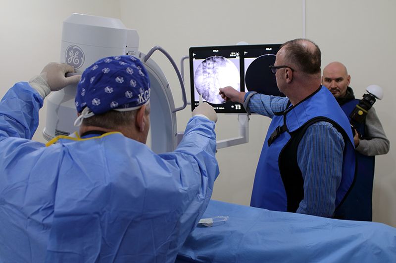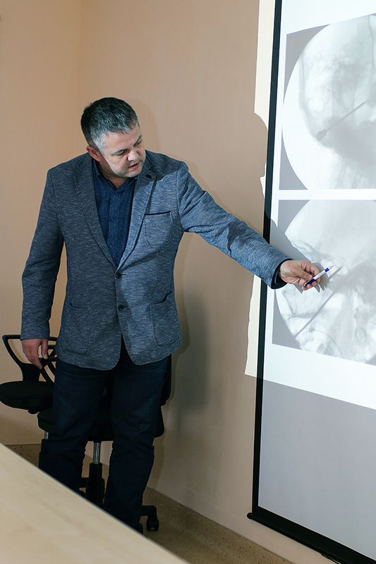 Темой первого дня практики стали интервенционные процедуры, которые применяются при наиболее тяжелых болевых синдромах, требующих, как правило, деструктивных техник: радиочастотная абляция тройничного узла при невралгии тройничного нерва, блокада чревного сплетения для уменьшения онкологической боли при раке поджелудочной железы. Это деликатная и очень ответственная работа, которая требует высокого уровня исполнения, что и было продемонстрировано нашими лекторами. Второй день был посвящен имплантации сложных устройств в условиях операционной.