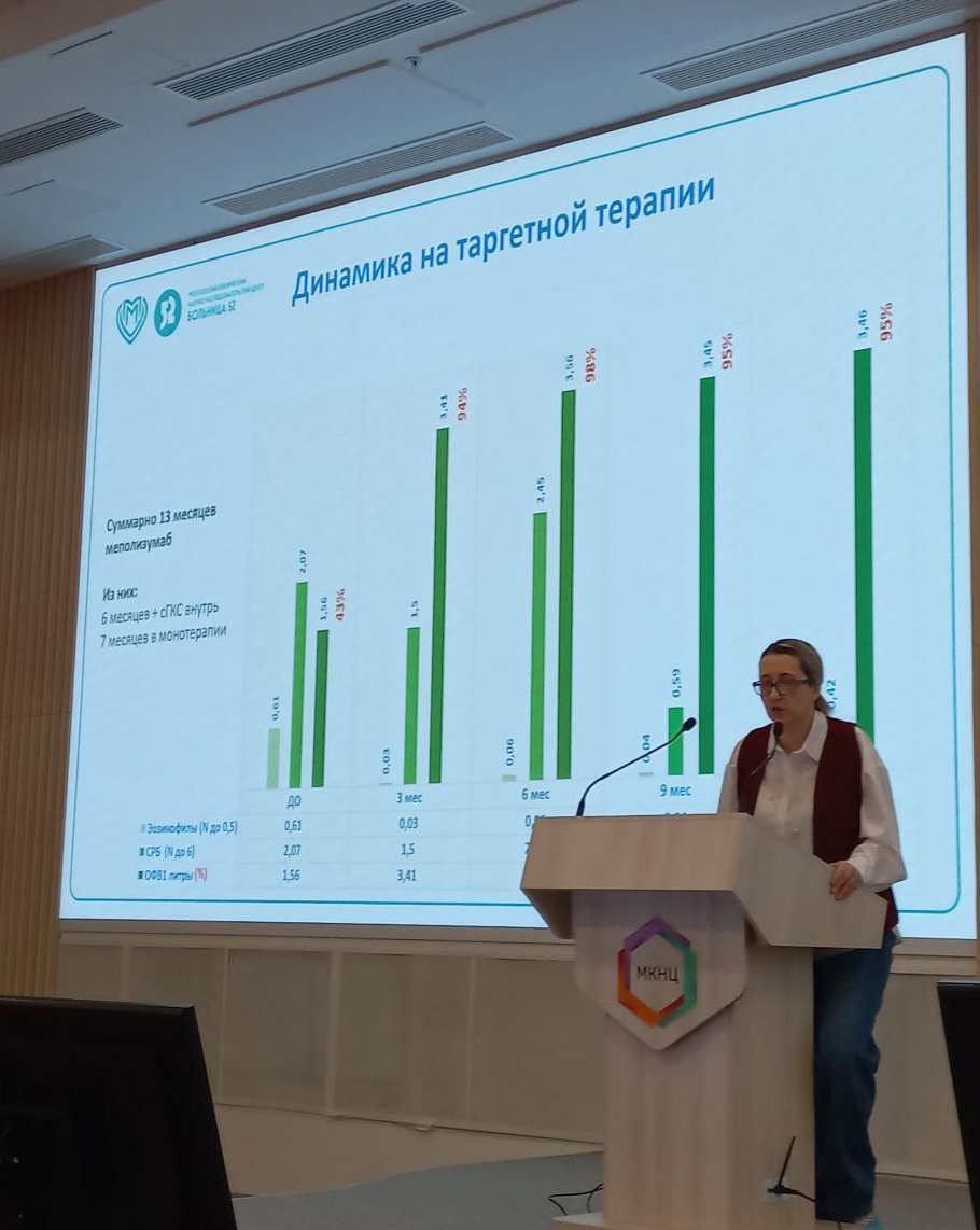 Аллерголог-иммунолог отделения аллергологии и иммунологии МКНИЦ Больница 52 Ульяна Алексеевна Маркина представила сложный путь дифференциальной диагностики между инвазивным аспергиллезом и аллергическим бронхолегочным аспергиллезом. Случай осложнялся наличием у пациентки врожденного дефекта иммунитета. Благодаря применению антагонистов ИЛ-5 удалось достичь успешного терапевтического результата.