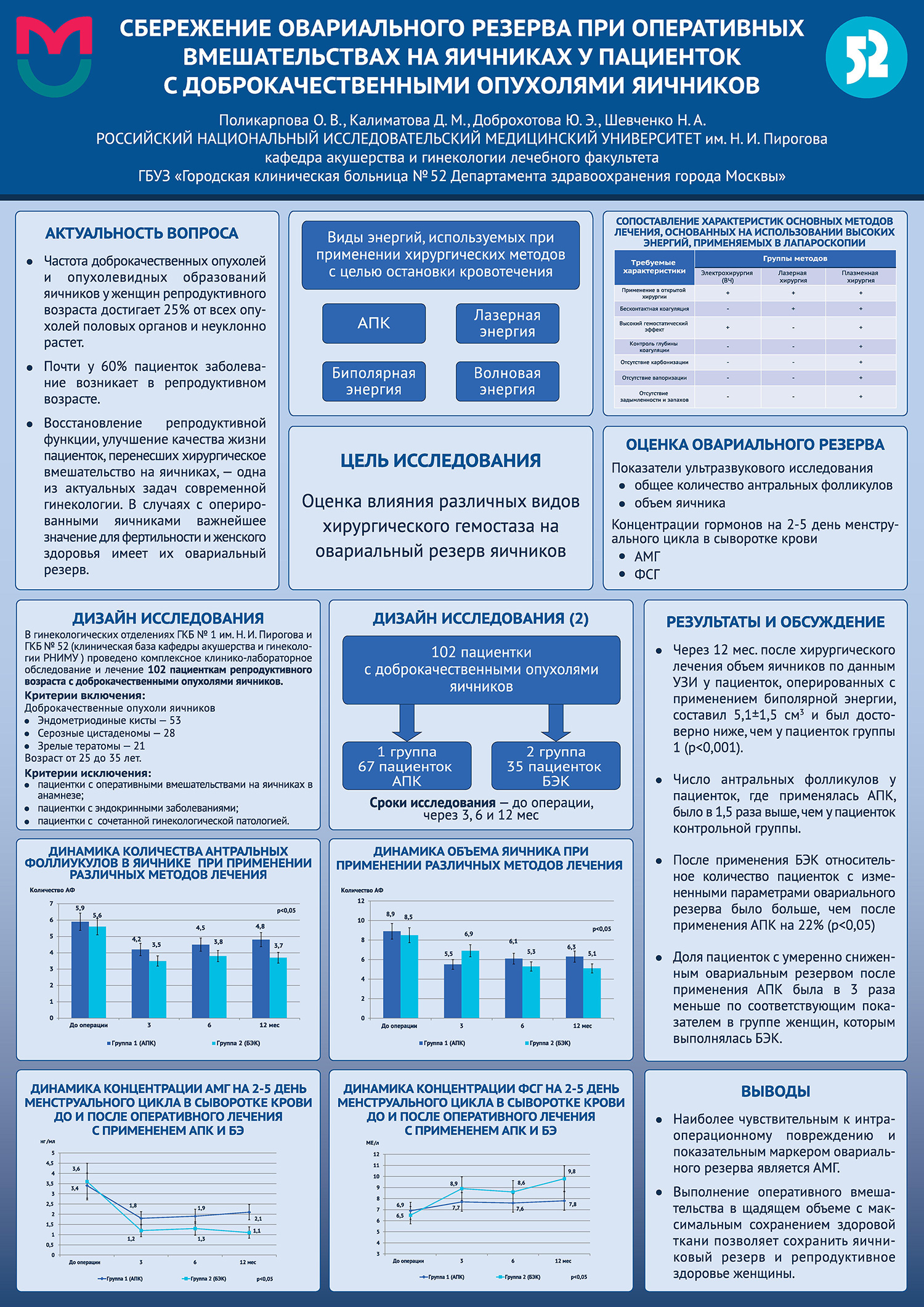 Сотрудники отделения гинекологии совместно с кафедрой акушерства и гинекологии лечебного факультета РНИМУ им. Н. И. Пирогова подготовили доклад на тему «Сохранение овариального резерва при оперативных вмешательствах на яичниках у пациенток с доброкачественными опухолями яичников.» В исследованиях, проведенных в отделении гинекологии, получены достоверные данные, что выполнение оперативного вмешательства в щадящем объеме с максимальным сохранением здоровой ткани позволяет сохранить яичниковый резерв и репродуктивное здоровье женщины.