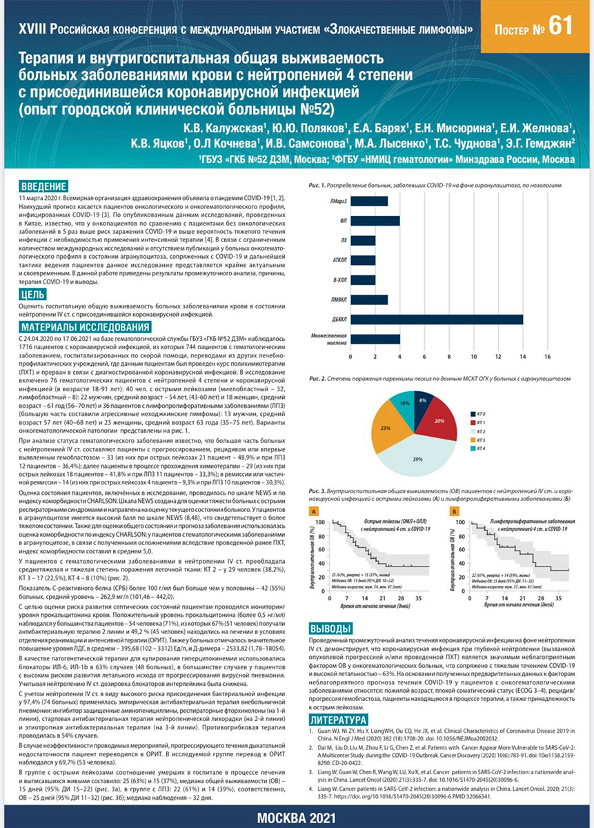 - постерным докладом «Терапия и внутригоспитальная общая выживаемостью больных заболеваниями крови с нейтропенией 4 степени с присоединившейся коронавирусной инфекцией (опыт ГКБ №52)». Работа коллектива авторов - Калужская К.В., Поляков Ю.Ю., Кочнева О.Л., Чуднова Т.С., Барях Е.А., Мисюрина Е.Н. и др.. - получила второе место в постерной сессии в большой конкуренции с 69 работами.