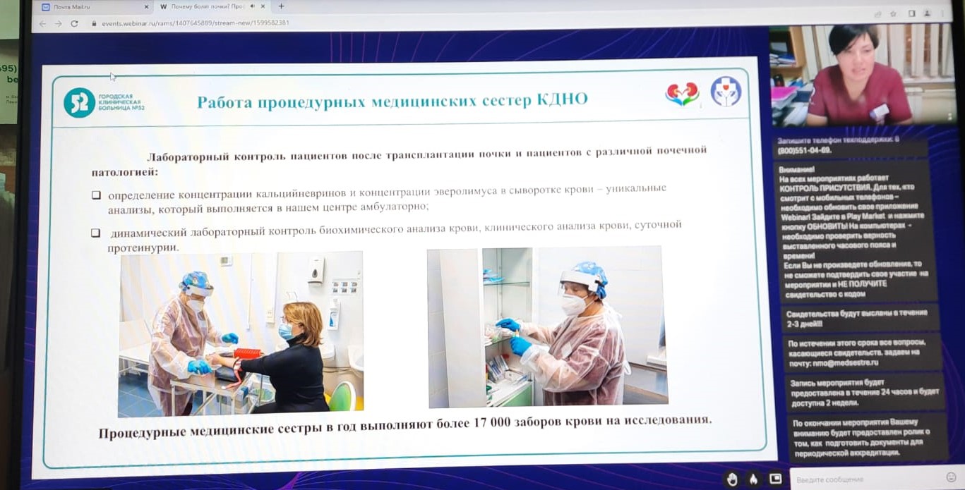 Шмакова Елена Александровна, старшая медицинская сестра КДНО — с докладом об организации сестринского процесса при оказании амбулаторной помощи пациентам с ХБП, после трансплантации и с орфанными заболеваниями;