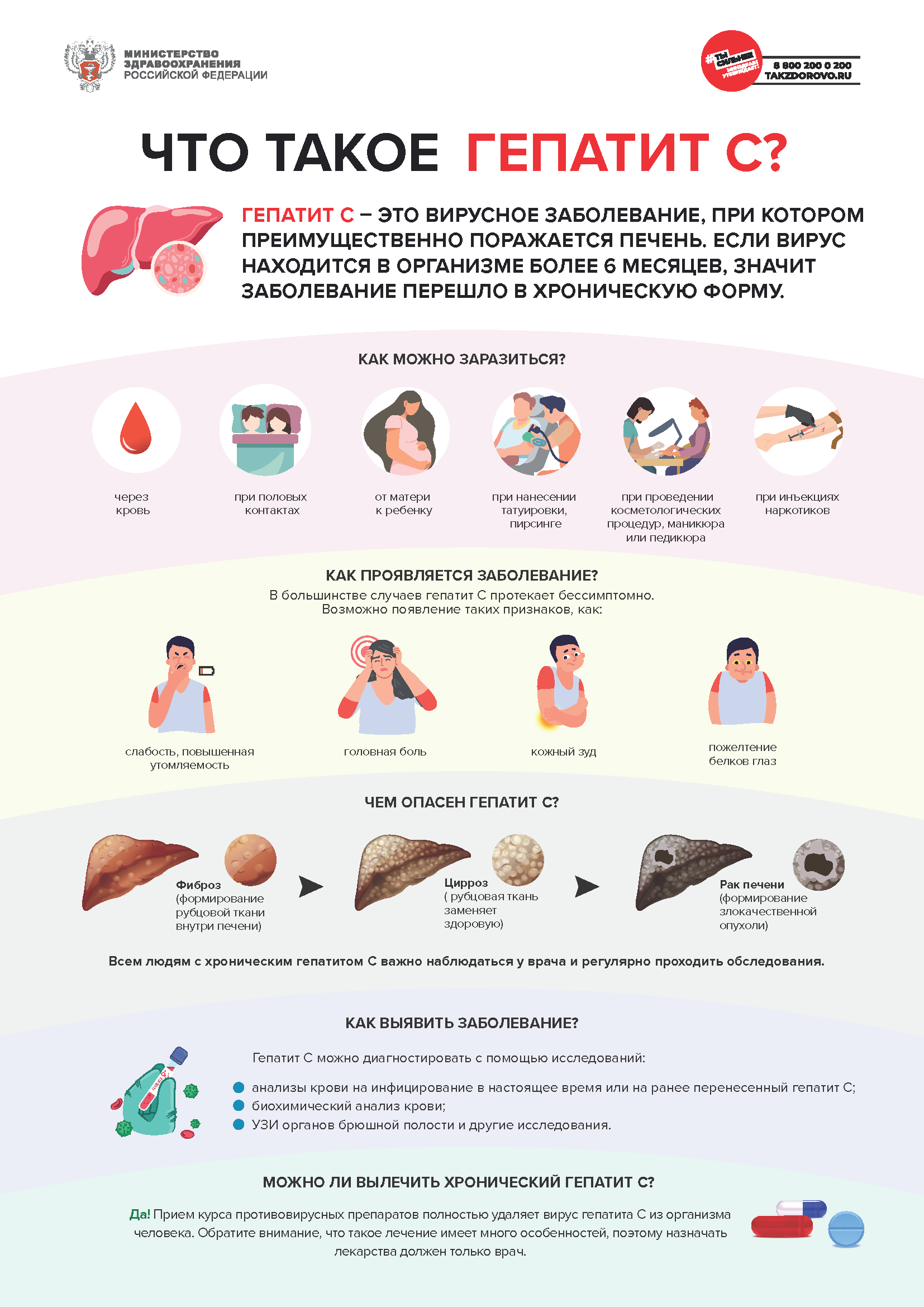 Гепатит С уже многие годы является излечимым заболеванием. Прием курса специальных противовирусных препаратов приводит к полному удалению (элиминации) вируса из организма человека и выздоровлению от гепатита С. Большинству пациентов в нестоящее время может быть назначен прием таблетированных препаратов в течение 2-3 месяцев. Но важно помнить, что лечение гепатита С имеет много особенностей, поэтому назначать препараты должен только врач. Человек, который успешно вылечился от гепатита С, не может заразить других людей.