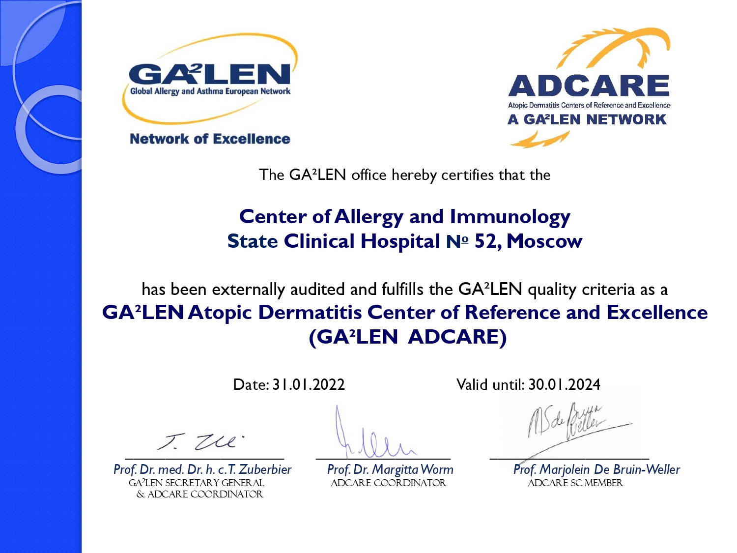 Мы рады сообщить, что по результатам международного аудита, проведенного профессором Федерального Университета Сан-Паулу, Луисом Энсина (Luis Ensina) и прошедшим в последний день января, Московскому Городскому Научно Практическому Центру Аллергологии и Иммунологии ГБУЗ ГКБ №52 ДЗМ (МГНПЦАиИ) присвоен статус GA2LEN-центра для больных с атопическим дерматитом (ADCARE).