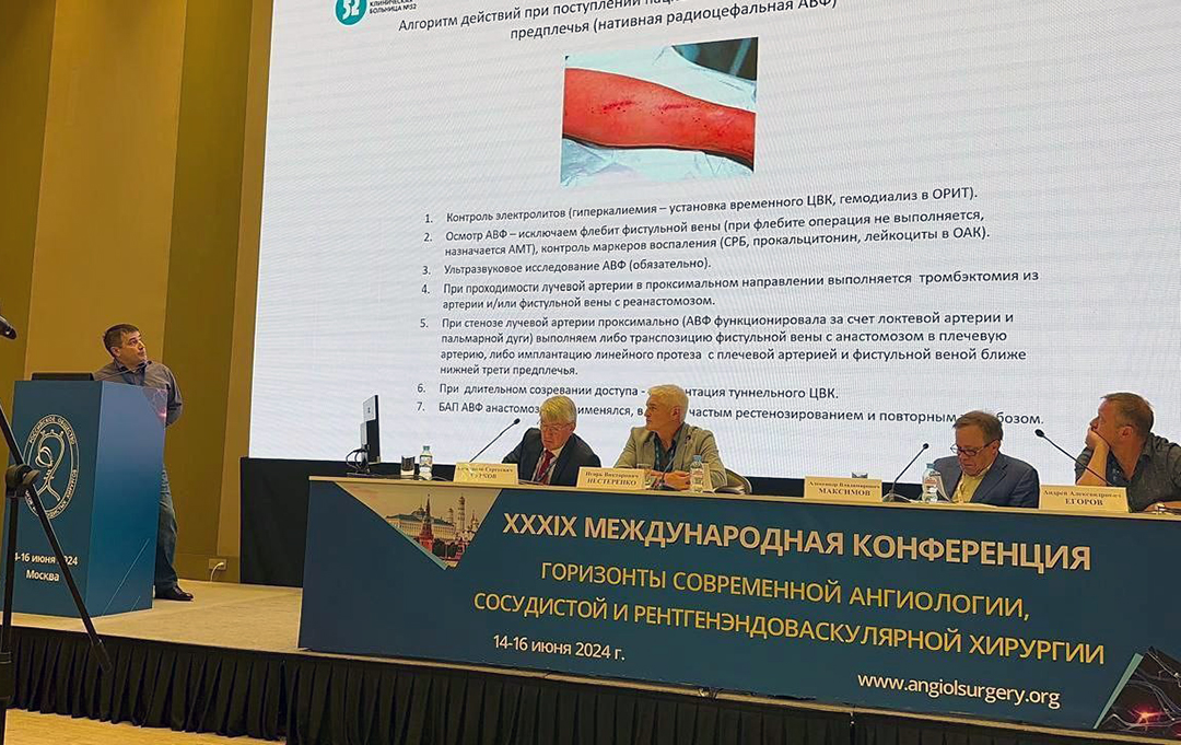 14-16 июня 2024 г. в Москве прошла XXXIX Международная конференция «Горизонты современной ангиологии, сосудистой и рентгенэндоваскулярной хирургии». Шахов Николай Леонидович, врач-хирург 2-го хирургического отделения ГКБ № 52 выступил с докладом «Хирургическая тактика при осложненном сосудистом доступе для гемодиализа на базе нефрологической службы ГКБ № 52», рассказав о проблемах сосудистого доступа у диализных больных: его разновидностях, насколько он важен для адекватного гемодиализа и продолжительности жизни пациентов.