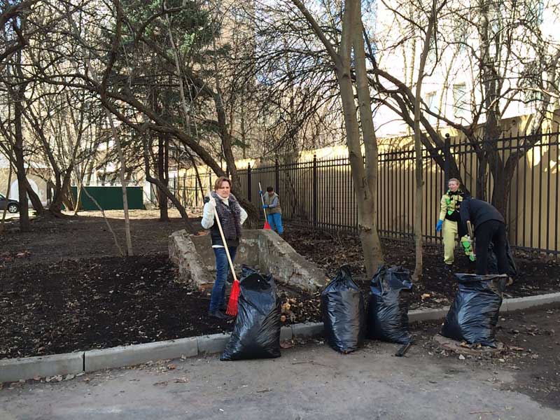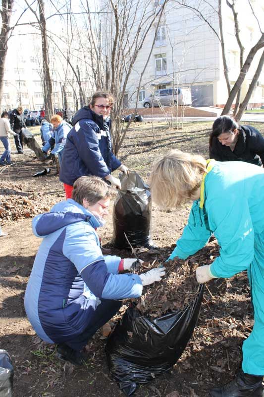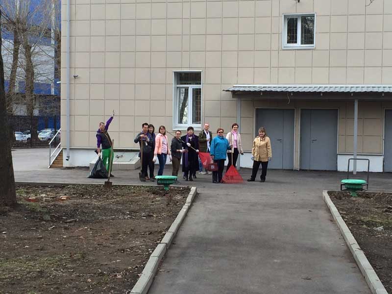Итак, в нашем фотоотчете: чудесный весенний день, совместный труд и очевидный результат коллективной работы — чистая, ухоженная территория.