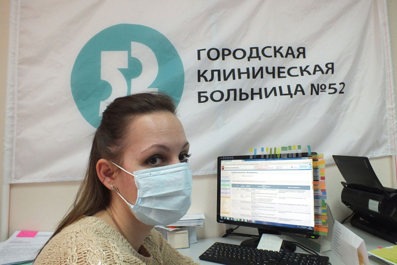 На своих рабочих местах сотрудники ГКБ №52 в обязательном порядке пользуются медицинской маской, защищая себя и своих пациентов.