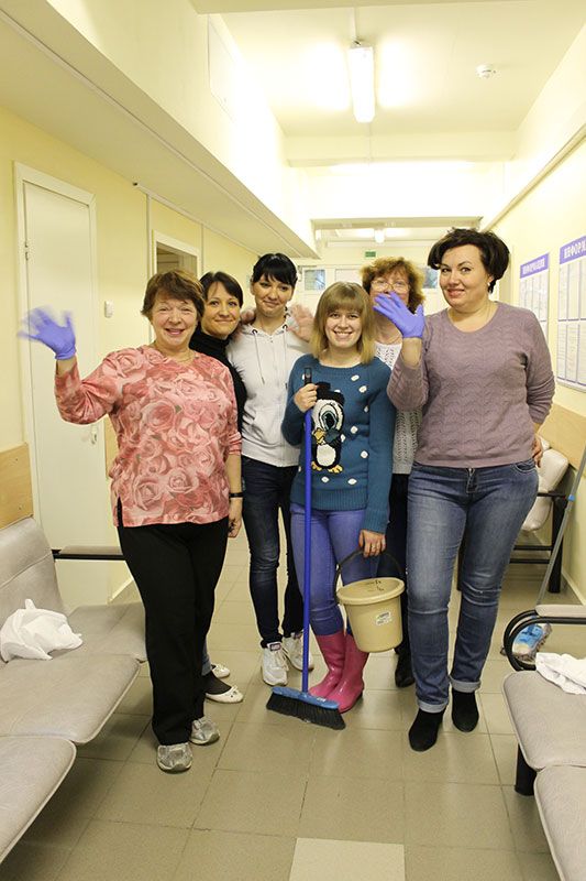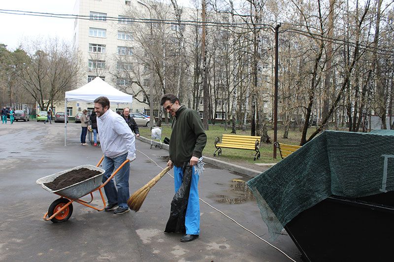 Сотрудники привели в порядок территорию вокруг своих корпусов: убирали остатки прошлогодних листьев, красили вазоны, сажали деревья. Кому не хватило работ на улице, трудились в отделениях на рабочих местах. А заряд бодрости и отличного настроения был получен ранним утром на коллективном чаепитии в шатре ГКБ в пункте раздачи инвентаря.