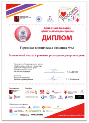 На закрытии были подведены итоги марафона «Достучаться до сердец». Отделение переливания крови ГКБ №52 было награждено дипломом «За системный подход в развитии регулярного донорства крови» и памятным символом марафона.