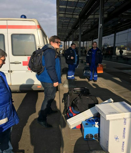 Фото: Руководитель Центра ЭКМО М.В.Кецкало, руководитель выездной реанимационной гемостазиологической бригады А.Ю. Буланов, эндоваскулярный хирург С.А.Бондаренко на пути в регион РФ для обеспечения проведения процедуры ЭКМО при транспортировке пациента, нуждавшегося в срочной высокотехнологичной медицинской помощи в Москве.