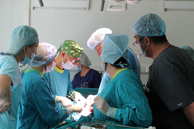 часто привлекают внимание коллег — идет и обучение, и обмен опытом, и интраоперационный консилиум. На фото бригада гинекологов и заведующий операционно-хирургическим блоком Михаил Юрьевич Богодаров, операция по удалению гигантской шеечной миомы матки.