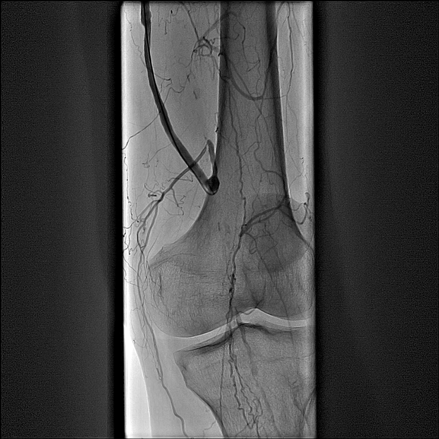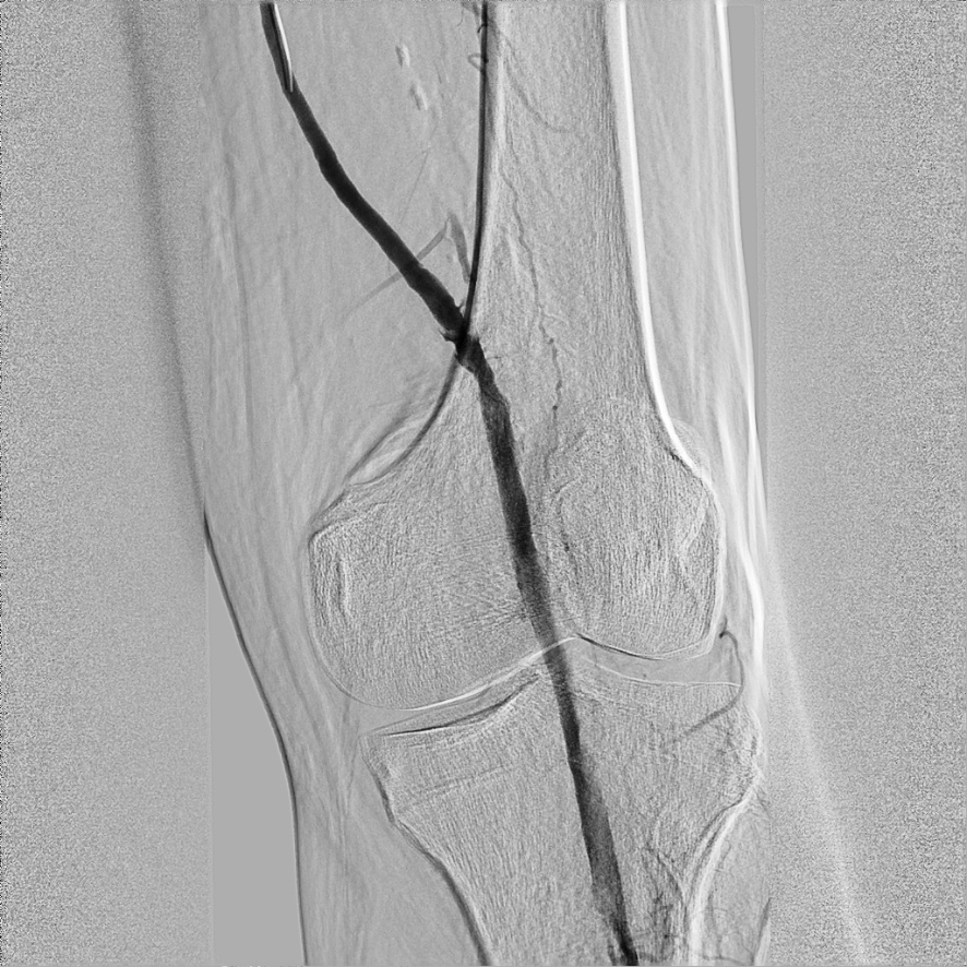На ангиографии обнаружена окклюзия (непроходимость) левой подколенной артерии в месте дистального анастомоза бедренно-подколенного шунта (рис.1). Была выполнена реканализация и баллонная ангиопластика подколенной артерии с хорошим эффектом, однако пройти из подколенной артерии в артерии голени не удалось, вследствие окклюзии устьев передней и задней большеберцовых артерий (рис.2). За местом окклюзии артерии голени заполнялись по коллатералям (ветвям сосудов, обеспечивающим кровоснабжение помимо основного сосуда). Было принято решение о повторной попытке реканализации передней большеберцовой артерии.