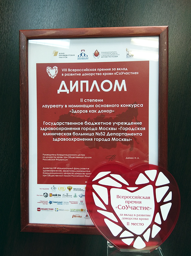 Отделение переливания крови ГКБ № 52 приняло участие в конкурсе VIII Всероссийской премии за вклад в развитие донорства крови «СоУчастие». По решению оргкомитета занял II место в номинации «Здоров как донор» за проект по развитию регулярного ответственного донорства и здорового образа жизни и отмечен дипломом II степени как лауреат в номинации основного конкурса «Здоров как донор».