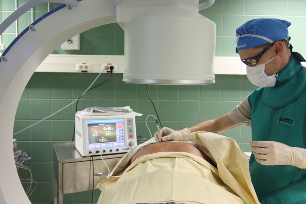 - И наконец, если это не помогает, или у пациента возникают побочные эффекты или нежелательные явления от лекарств, мы переходим к более инвазивным и более «агрессивным» методам, так называемому интервенционному лечению боли — блокадам или радиочастотному воздействию на нервные структуры. Это серьёзные манипуляции, когда мы в операционной под контролем рентгена или ультразвуковой навигации делаем различные инъекции. Первоначально на осмотре мы пытаемся установить, какие именно структуры позвоночника, суставов или нервов являются проводниками или генераторами боли. Далее мы под контролем навигационного оборудования устанавливаем «проводники» (иголки или канюли) и вводим прицельно к этим структурам медикаменты или воздействуем высокочастотным электрическим полем. Это всё объединяется в общий блок интервенционного лечения.