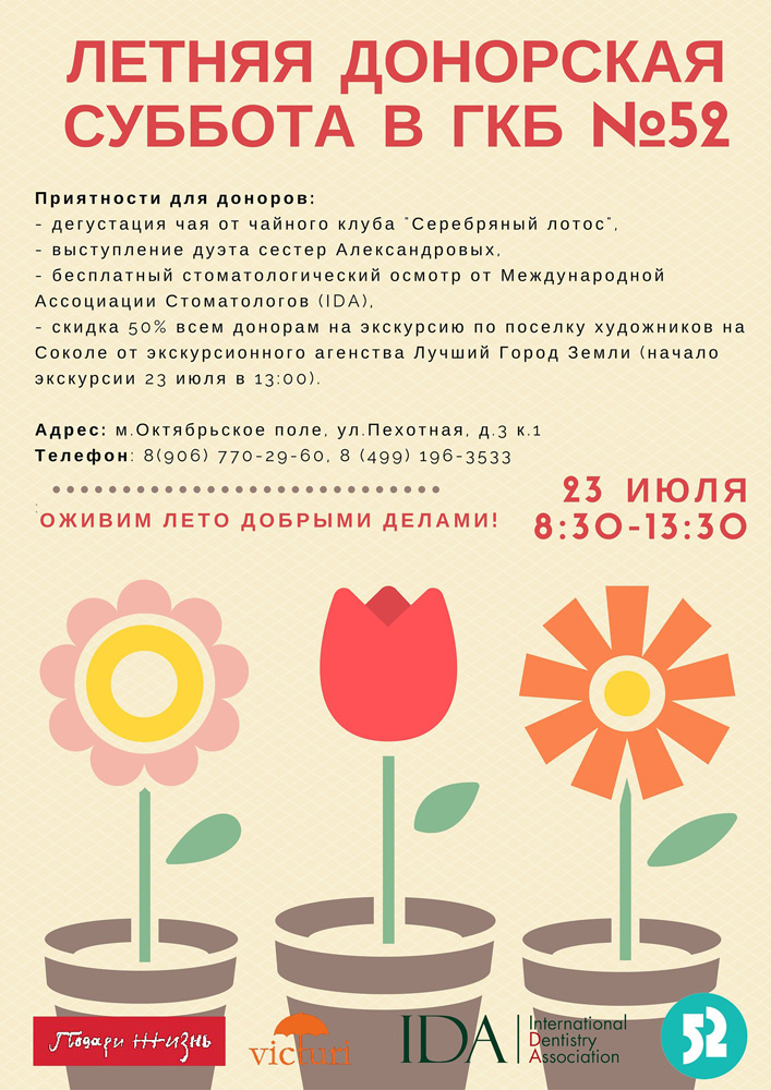 В разгар июля городская клиническая больница №52 объявляет самую летнюю донорскую субботу. Ждем доноров на сдачу крови 23 июля с 8:30 до 13:30.