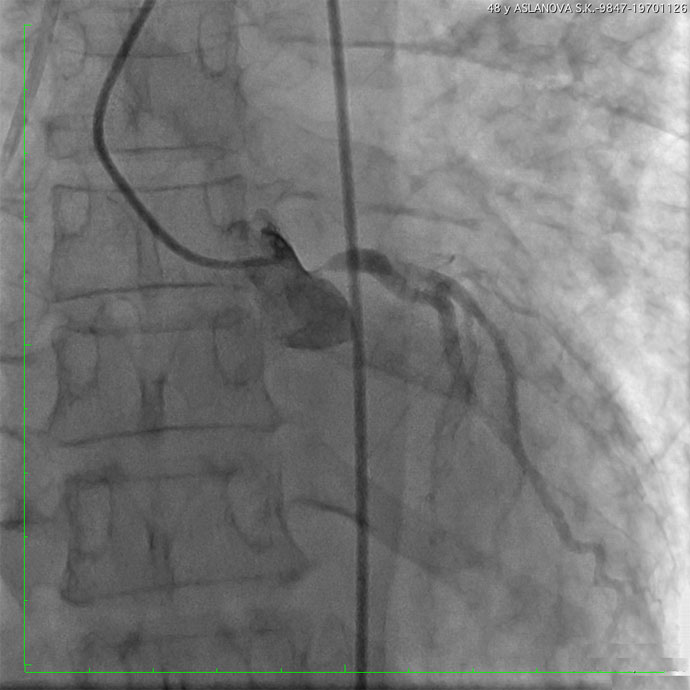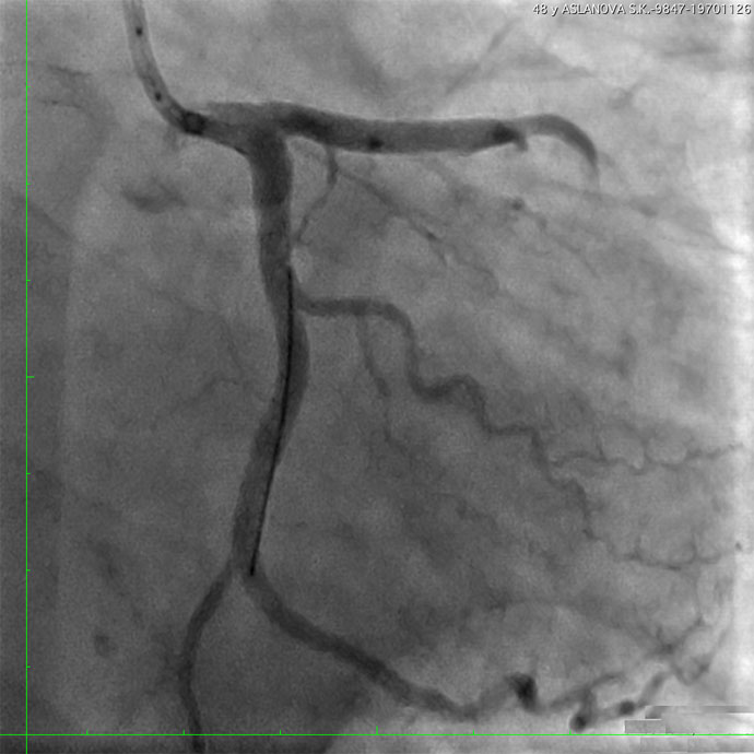 Обращали на себя внимание прогрессирующее снижение толерантности к физическим нагрузкам и эпизодические давящие, жгучие боли за грудиной. В результате проведенного обследования по данным ЭКГ выявлены ишемические изменения миокарда, по результатам КТ — признаки отека легких. Диагноз пневмонии не подтвердился. Проведена диагностика на предмет острой коронарной патологии: по результатам Эхо-КГ выявлено снижение общей систолической функции миокарда левого желудочка с нарушением его локальной сократимости. По лабораторным данным выявлено повышение уровня кардиоспецифических ферментов, указывающих на повреждение миокарда. После дообследования было принято решение о проведении экстренной коронароангиографии (КАГ).