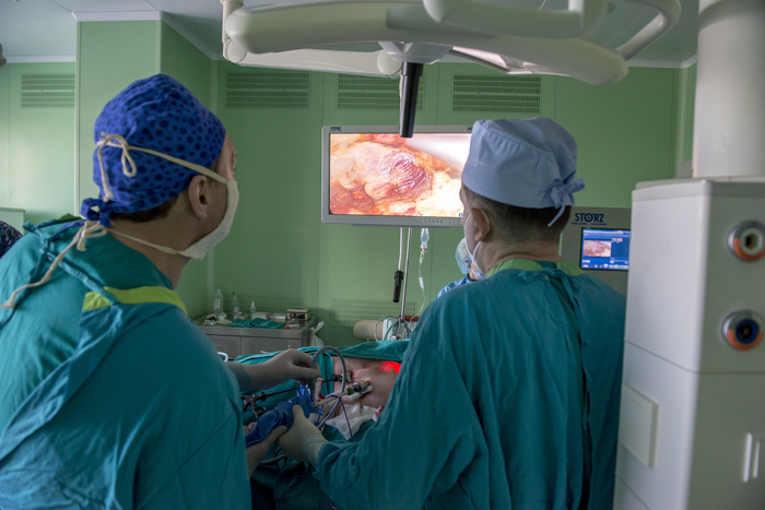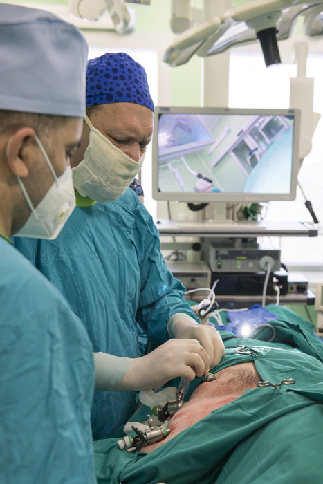 Хирурги ГКБ № 52 выполнили эндоскопическую паратиреоидэктомию слева (удаление левой паращитовидной железы минимально инвазивным эндоскопическим методом). Обратите внимание: проколы для введения хирургических инструментов были выполнены в области подмышечной впадины, плечевого сустава и ареолы слева. Использование такого доступа позволило обойтись без привычного разреза и последующего послеоперационного рубца на передней поверхности шеи.