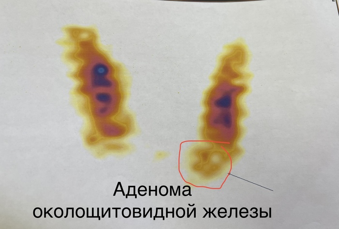 Пациент был дообследован амбулаторно, диагностирована аденома нижней левой околощитовидной железы диаметром 1,5 см, подтвержденная затем сцинтиграфией. Направлен в отделение хирургии № 1 ГКБ № 52 для оперативного лечения.