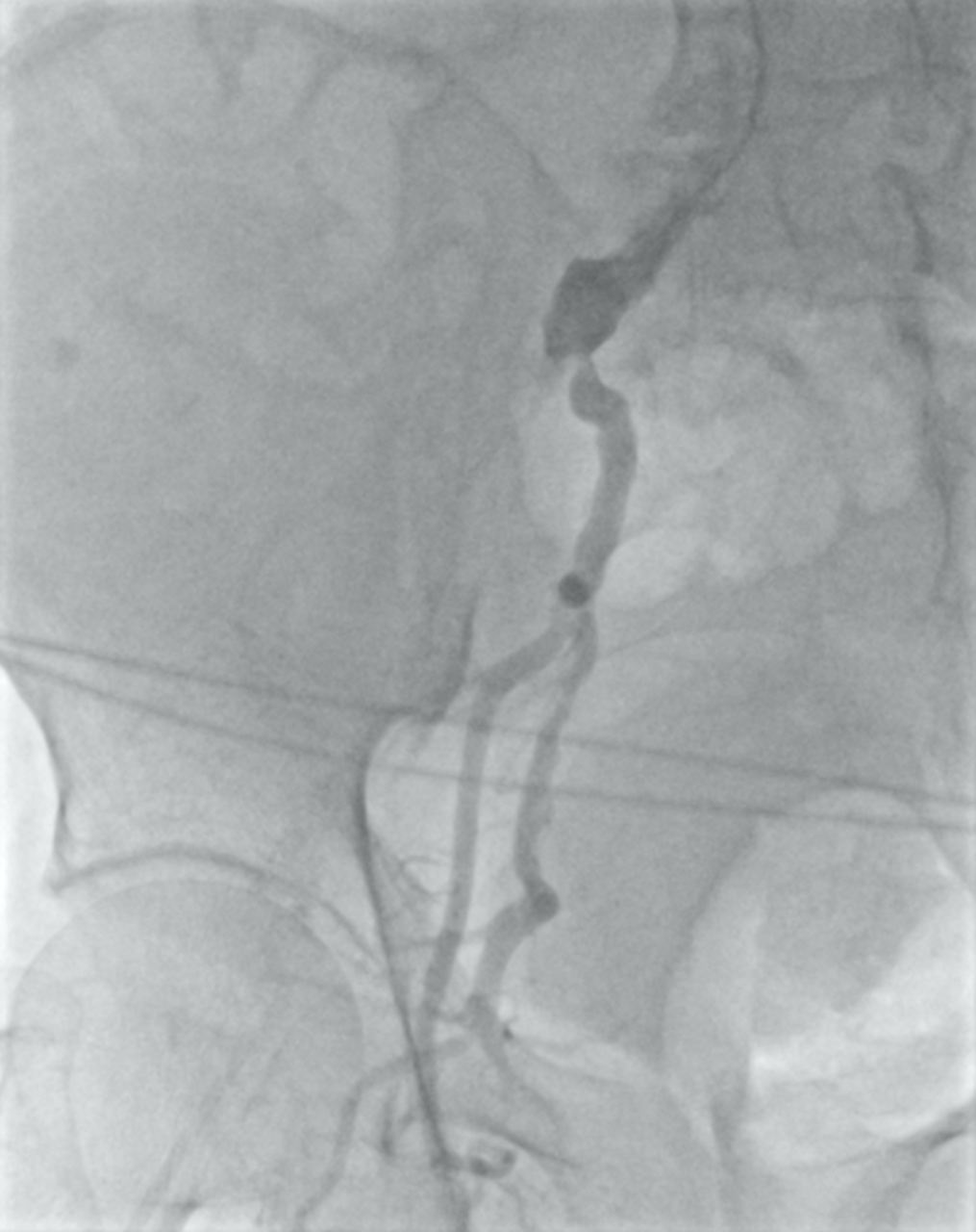 Под местной анестезией выполнена пункция правой плечевой артерии, установлен интродьюсер, проведен диагностический катетер в правую общую подвздошную артерию (ОПА), выполнено антеградное контрастирование ОПА: окклюзия наружной подвздошной артерии от устья, дополнительно выявлен стеноз устья ВПА 90% (рис. 2).