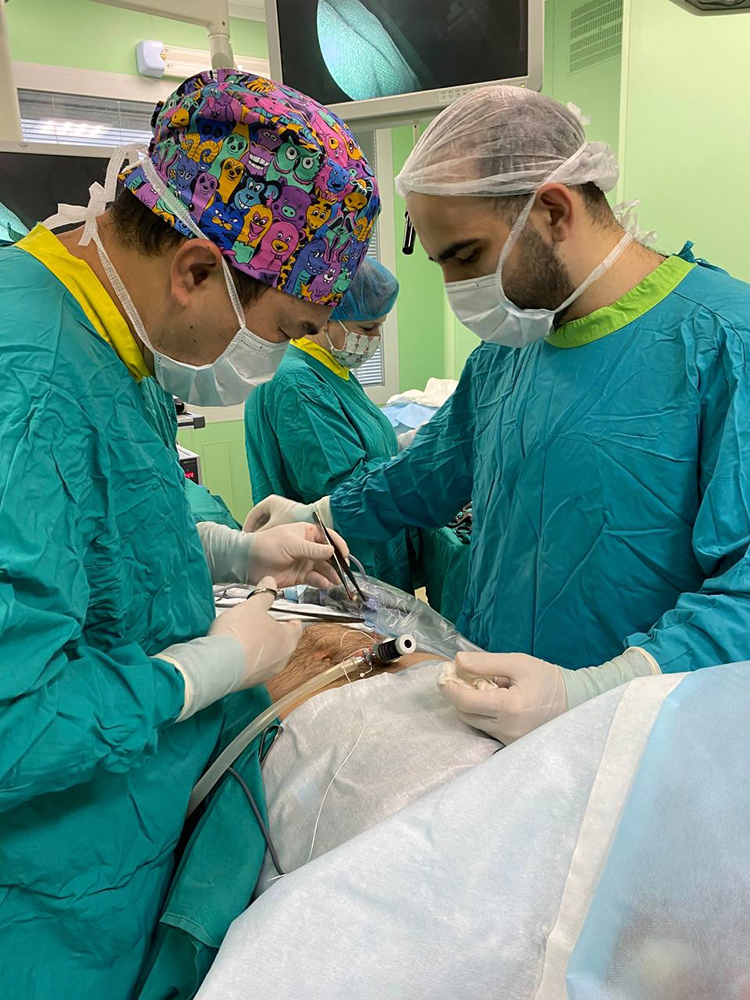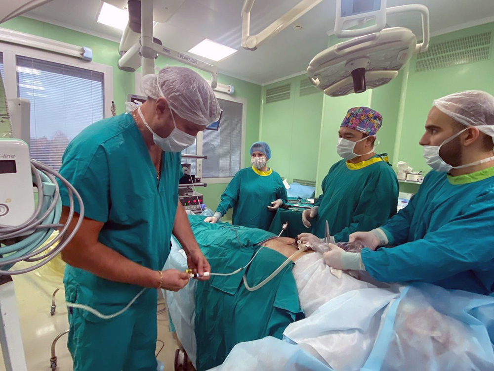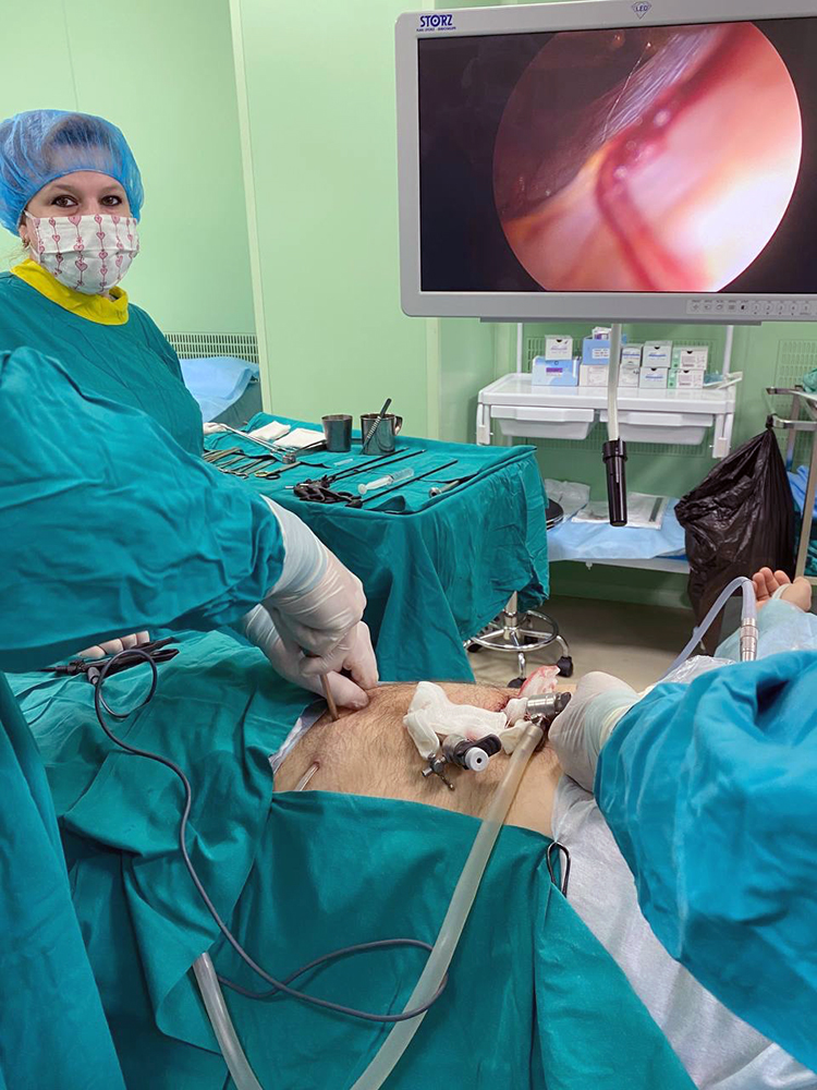Пациент был госпитализирован в отделение хирургии ГКБ № 52 для оперативного лечения. Состоялся консилиум: учитывая невозможность дальнейшего проведения перитонеального диализ у пациента с двусторонней паховой грыжей, решено провести эндоскопическую экстраперитонеальную пластику передней брюшной стенки с обеих сторон еТЕР — операцию по устранению грыжевых дефектов передней брюшной стенки сетчатыми имплантами.