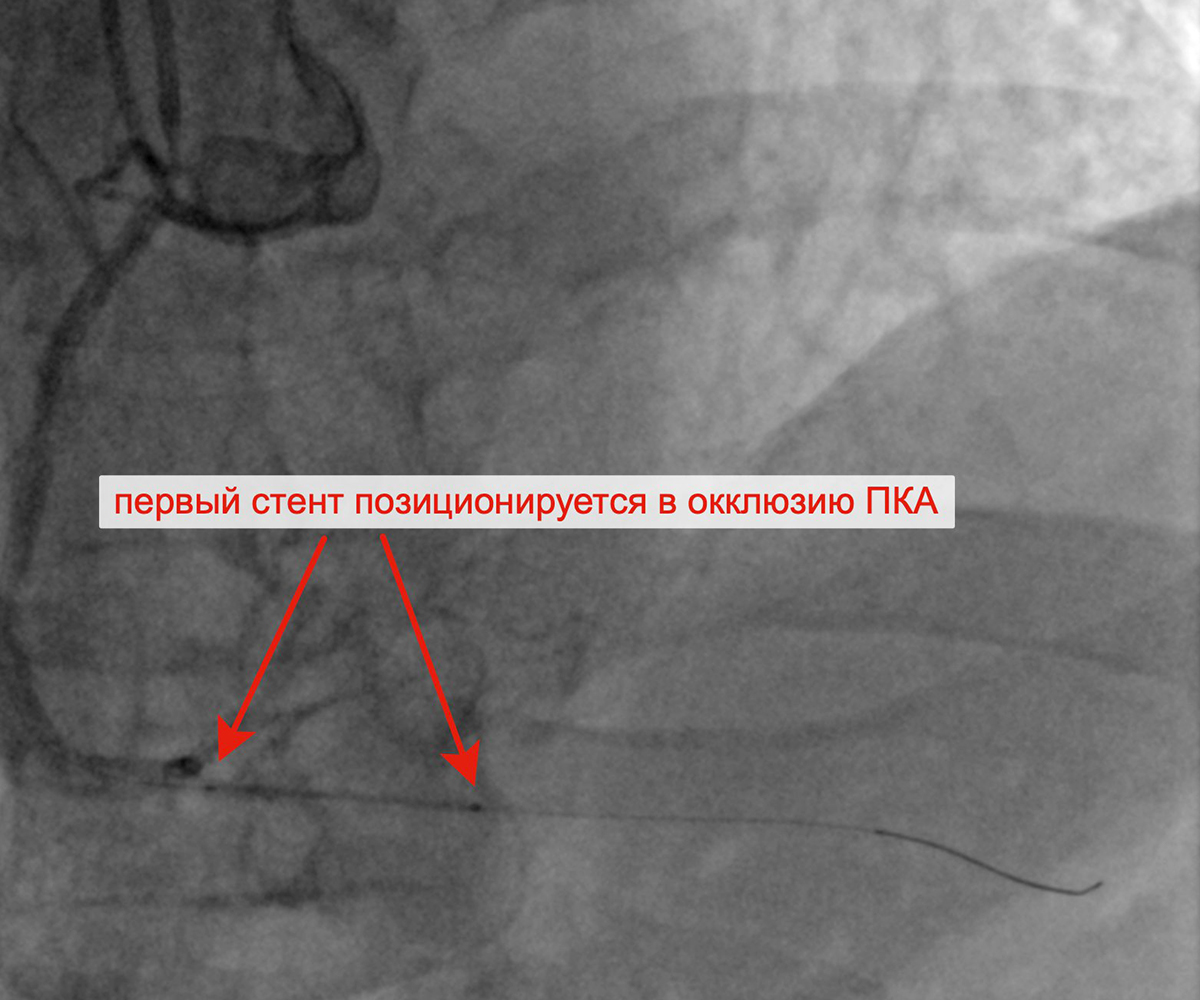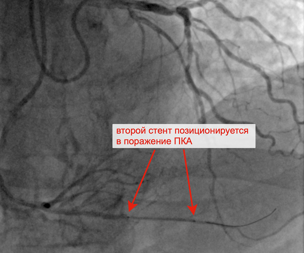Позиционирование первого стента в ПКА после предилатации Позиционирование второго стента в ПКА