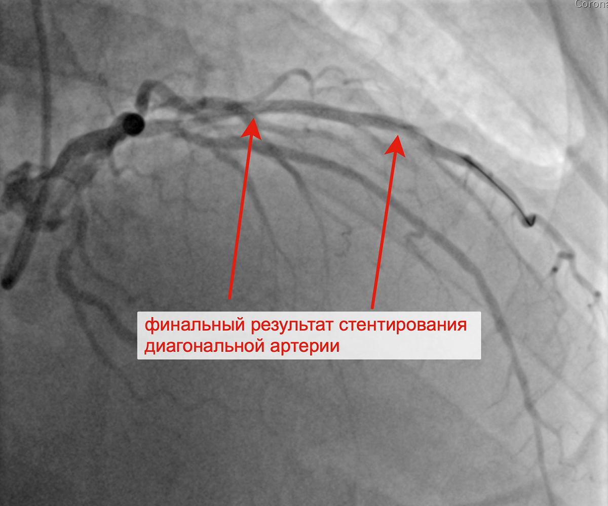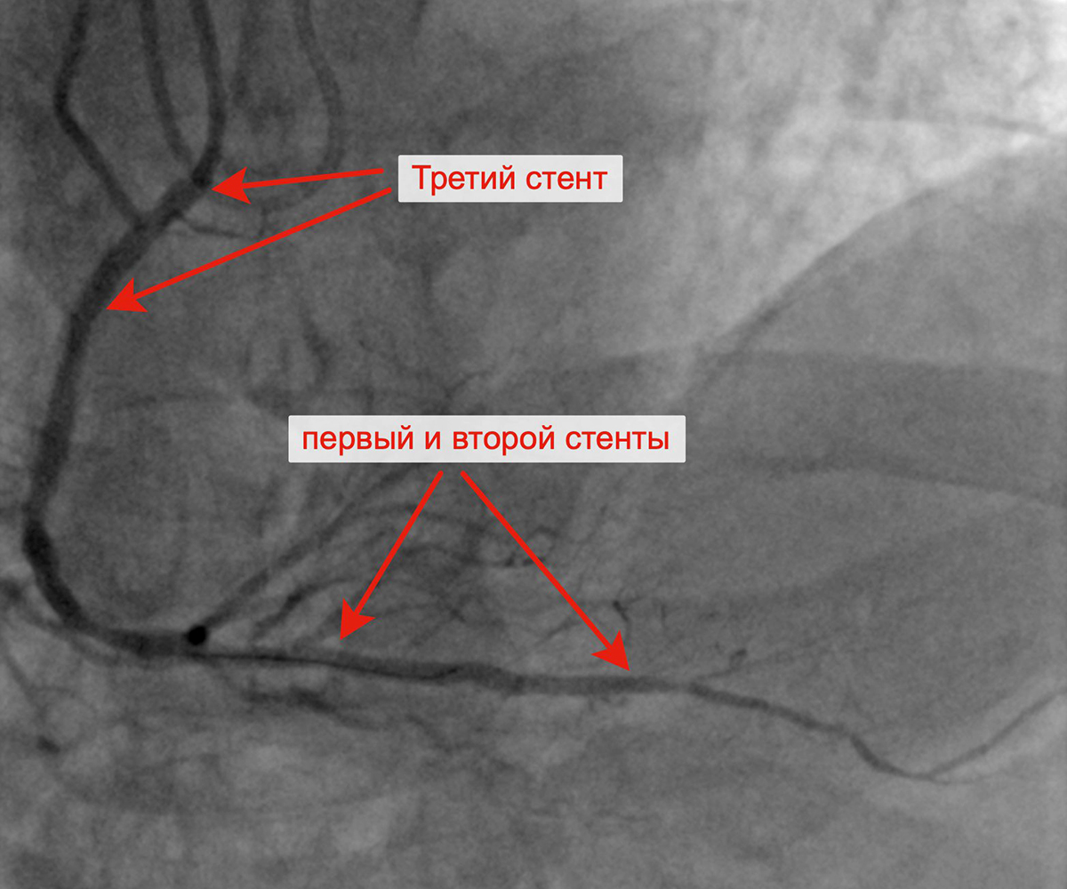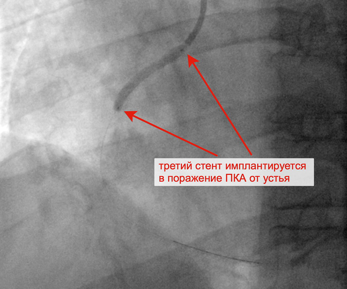 Чрескожное коронарное вмешательство (ЧКВ) на хронической окклюзии ПКА выполнялось билатеральным лучевым доступом: через левую лучевую артерию диагностическим катетером параллельно выполнялись съемки ЛКА, что позволило визуализировать через межсистемные коллатерали дистальное русло постокклюзированной ЗМЖА и контролировать процесс реканализации хронической окклюзии и проведение коронарного проводника в дистальное русло ЗМЖА. Успешно была выполнена реканализация ЗМЖА, баллонная ангиопластика и стентирование правой коронарной артерии (3 стента с лекарственным покрытием). При контрольной ангиографии: стенты и ПКА проходимы, позиционирование стентов адекватное, диссекции или остаточного стеноза в стентированных сегментах ПКА нет, кровоток TIMI 3 по ПКА и всем ветвям. Пациент был на следующий день выписан из клиники.