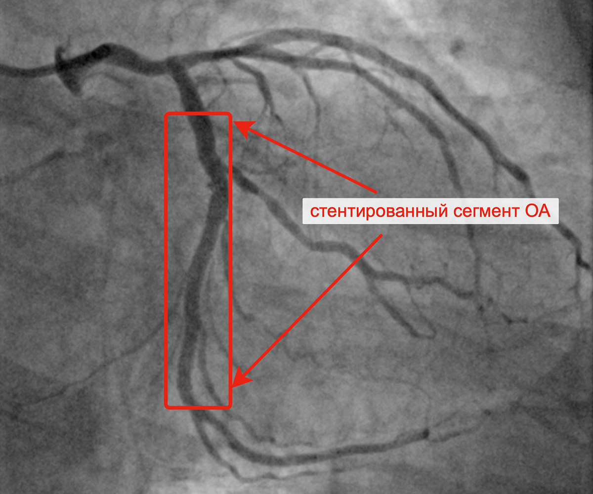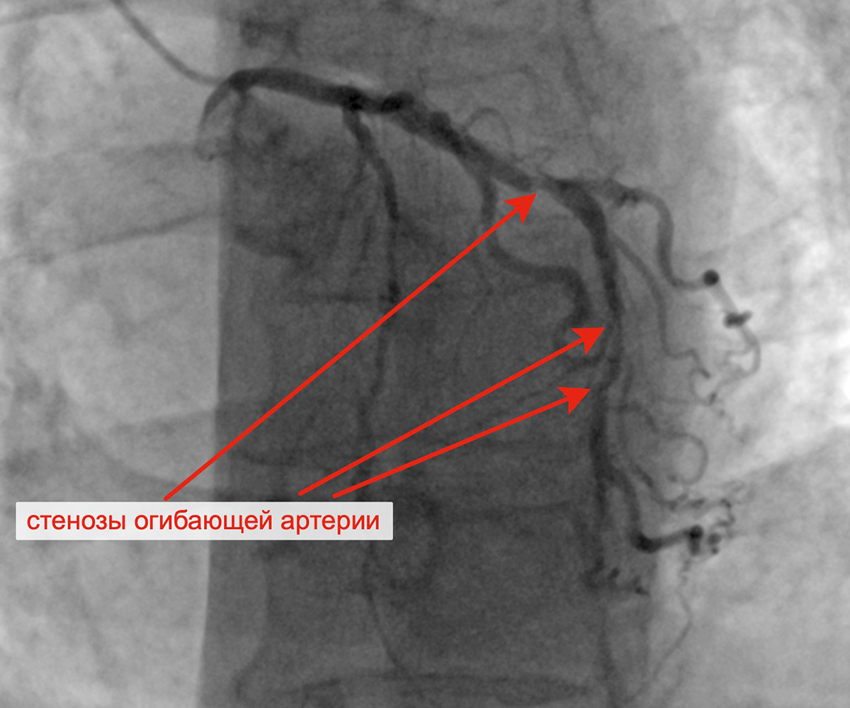 В марте 2023 г. в связи сохраняющейся одышкой, загрудинными болями при физической нагрузке пациент госпитализирован в кардиологическое отделение для решения вопроса о проведении следующего, третьего этапа реваскуляризации. Учитывая наличие ангинозных болей, результаты проведенных обследований (положительным стрессЭХО), коронарографии, наличие гемодинамически значимых стенозов коронарных артерий, принято решение о проведении баллонной ангиопластики и стентирования огибающей артерии (2 стента с лекарственным покрытием). Контрольная ангиография после успешного чрескожного коронарного вмешательства: стенты и ОА с ветвями проходимы, позиционирование стентов адекватное, диссекции или остаточного стеноза в стентированном сегменте ОА нет, кровоток TIMI 3 по ОА и всем ветвям.