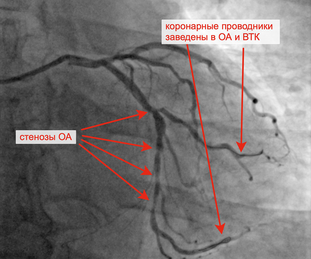 Критические стенозы ОА Заведены проводники в ОА и ВТК