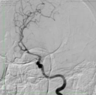 Выполнена селективная ангиография артерий головного мозга, на которой выявлена окклюзия левой среднемозговой артерии в М1 сегменте — в самом начале одной из основных артерий головного мозга (рис. 1).