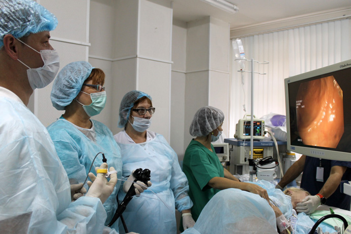 Заведующая эндоскопическим отделением Стручкова Елена Юрьевна, врач-эндоскопист Могильницкий Игорь Евгеньевич полностью удалили образование двумя большими фрагментами малоинвазивным, бескровным методом, извлекли опухоль с использованием специального сачка и отправили на гистологическое исследование. Госпитализация заняла 2 дня. При гистологическом исследовании установлено, что образование доброкачественное с дисплазией 2-3 ст.