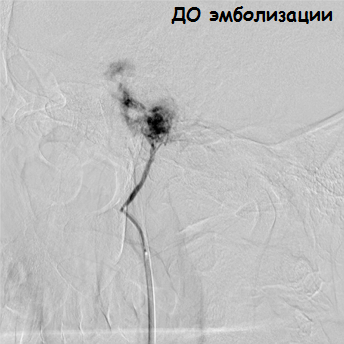 — Через бедренную артерию микрокатетер был введен в артерию, непосредственно кровоснабжающую опухоль, — комментирует ситуацию заведующий отделением РХМДиЛ Александр Евгеньевич Ванюков. — Артерия диаметром около 1 мм является ветвью верхнечелюстной артерии, и, на наш взгляд, безопаснее и эффективнее выполнять точную селективную катетеризацию и эмболизацию артерии, питающей опухоль, чем эмболизировать всю верхнечелюстную артерию. Мы выполнили суперселективную эмболизацию путем введения эмболизационного материала размером 700 нм, что привело к полному прекращению кровоснабжения опухоли.
