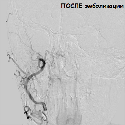 На 2-е сутки после эмболизации отохирурги повторно открыли барабанную полость и на абсолютно сухом операционном поле смогли удалить остатки опухоли и провести реконструктивную операцию с целью улучшения слуха. Послеоперационный период без осложнений, пациентка выписана на 5-е сутки.