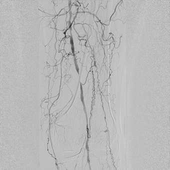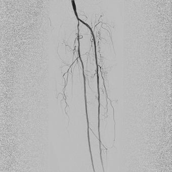 При мультиспиральной КТ нижних конечностей наблюдалась картина атеросклеротического поражения сосудов нижних конечностей с гемодинамически значимыми стенозами (до 70%) левой общей и обеих наружных бедренных артерий, стенозом правой подколенной артерии. Консилиумом решено провести попытку эндоваскулярной реканализации артерий правой ноги, для сохранения опорной функции.