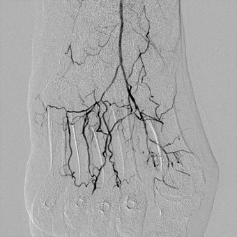 — У пациентов с синдромом диабетической стопы, к сожалению, чаще выполняется ампутация конечности, чем попытка восстановления кровотока в пораженной конечности. Хотя на сегодняшний день возможности сосудистой и эндоваскулярной хирургии позволяют если не сохранить конечность целиком, то хотя бы сберечь ее опорную функцию, тем самым сохранив пациенту мобильность, а значит и высокое качество жизни. Эта пациентка поступила к нам с сухой гангреной без инфицирования 1, 2, 3 пальцев правой стопы 2А степени по классификаци Техасского университета. Была предпринята попытка эндоваскулярной реконструкции пораженных артерий бедра и голени, критическое сужение или окклюзия которых и приводит к синдрому диабетической стопы и необходимости ампутации. Нами была выполнена реканализация подколенной, передней большеберцовой артерии и малоберцовой артерии правой ноги. Полностью пройти подошвенную дугу и заднюю большеберцовую артерию не удалось, но, несмотря на это, полностью был восстановлен кровоток в стопе и пальцах.