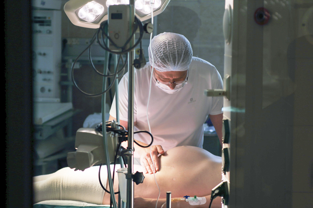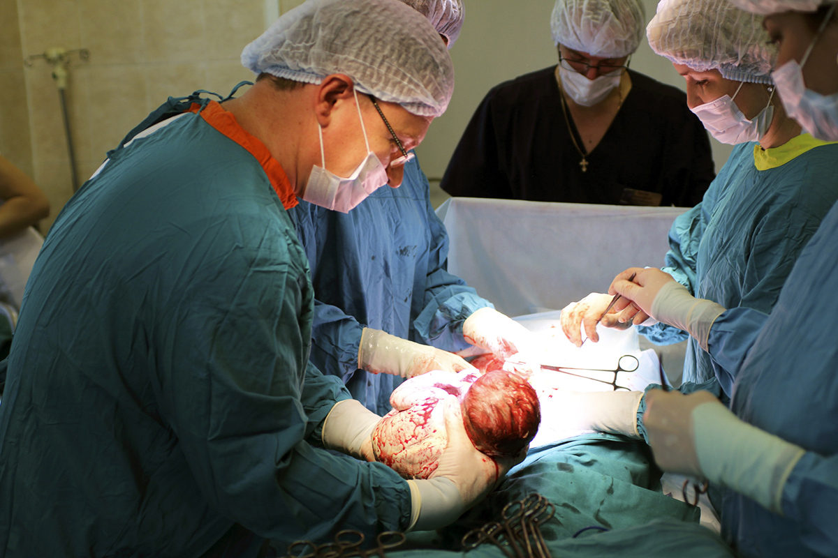 В сроке беременности 38-39 недель пациентка госпитализирована в отделение патологии родильного дома для определения сроков и способа родоразрешения. По заключению нефролога, функция почечного трансплантата удовлетворительная. Консилиумом принимается решение об оперативном родоразрешении. Учитывая анатомическую близость трансплантата с маткой, в состав оперирующей бригады был включен врач-уролог, заведующий отделением урологии Р. Н. Трушкин.