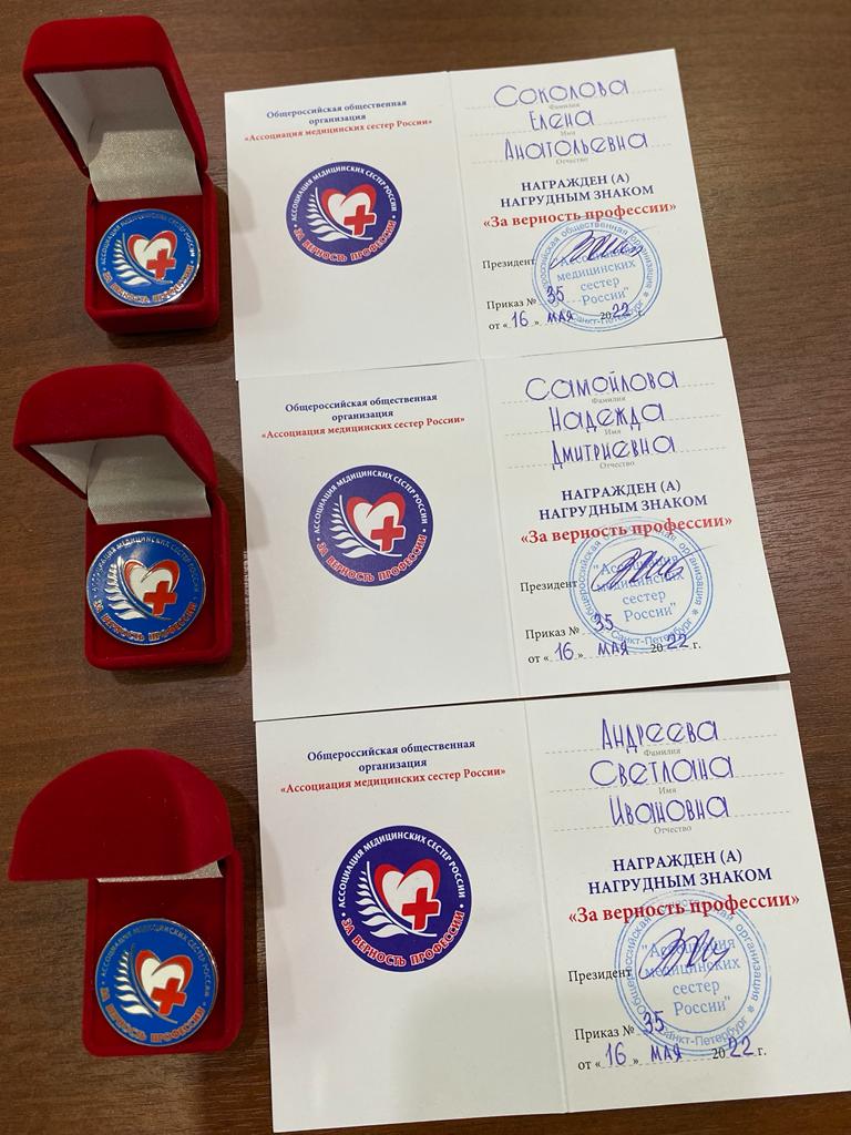 Нагрудными знаками «За верность профессии» были награждены заместитель главного врача по работе с сестринским персоналом Елена Соколова, старшая медицинская сестра 3-го нефрологического отделения Светлана Андреева, старшая медицинская сестра отделения ревматологии Надежда Самойлова. Такие знаки теперь уже носят шесть сотрудников больницы, в том числе главная медицинская сестра Наталья Сухотина, старшая медсестра учебно-методического кабинета Марина Богачева и медицинская сестра приемного отделения Наталья Черемушкина, более 40 лет проработавшая в больнице.