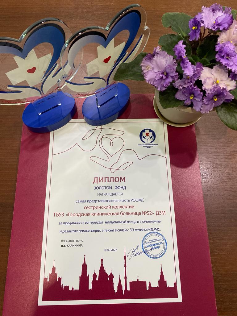 19 мая на праздничном вечере в честь 30-летия РООМС президент РАМС В.А. Саркисова вручила диплом «Золотой фонд» всему сестринскому коллективу 52-й больницы — за вклад в развитие РООМС, преданность профессии и делу ее продвижения.