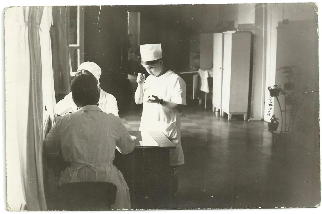 Рентгенологические исследования с контрастом выполнялись во 2-м корпусе (там, где сейчас военкомат). Молоденькие медсестры со скоростью ветра перемещали пациентов по подземному переходу между корпусами. Рентгенолог Самсон Соломонович по телефону шумно требовал немедленной доставки больных на исследования, ругался за задержки, а хлопот у сестричек тех времен было не меньше, чем сейчас, лишь только акценты сместились. Юные медсестры не знают сейчас, как это —кипятить, стерилизовать в стальных биксах стеклянные многоразовые шприцы, собирать мудреные системы для капельниц с участием рыжих резиновых трубок, разбирать, мыть и снова кипятить и стерилизовать.