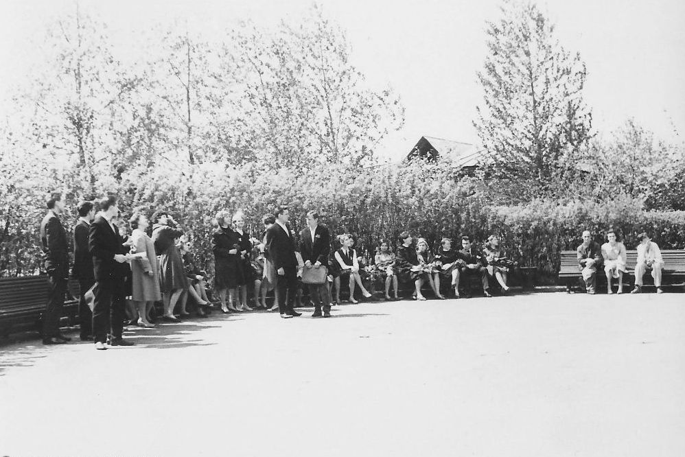 Первый корпус был, как мы сейчас понимаем, был очень вместительный. На одном только первом этаже располагалась абсолютно вся администрация и даже библиотека. Здания утопали летом в зелени —территория больницы была и остается частью Покровско-Стрешневского парка. Сквер с лавочками на фото — это площадка между нынешним 1 и 10 корпусами и ЦСО, тогда — любимое место прогулок пациентов.