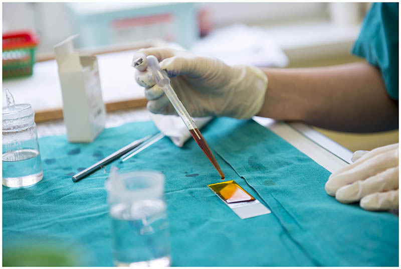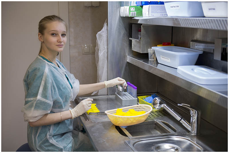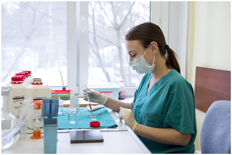 Медицинский лаборант Оксана Владимировна Казанджан выполняет окраску препаратов
