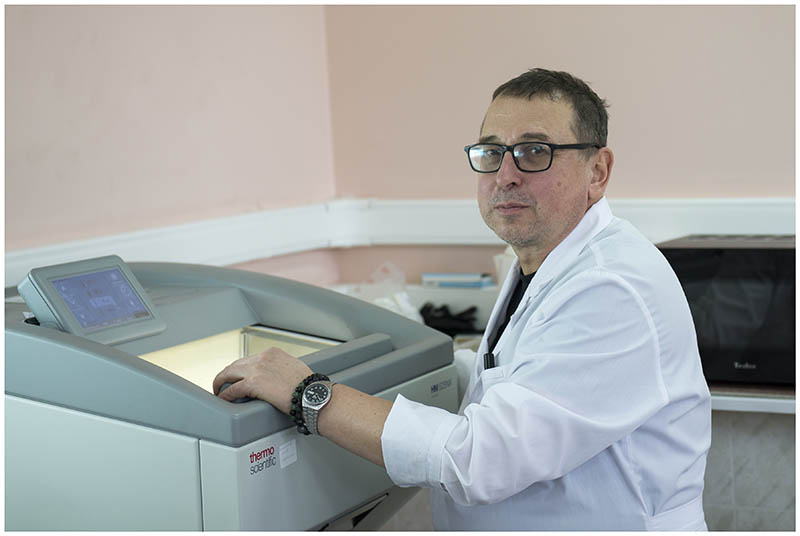 Суханов досконально изучил технологию подготовки материала биопсии для иммунофлуоресцентного анализа. Сначала готовил препараты сам, потом обучил этому лаборантов. «Раньше при анализе биопсий ограничивались методом световой микроскопии. Сейчас обязательными являются два метода, световая и иммунофлуоресцентная микроскопия. Иммунофлуоресцентный анализ позволяет существенно расширить понимание патологического процесса. За тем диагнозом, который раньше ставился только на основании световой микроскопии, могут стоять различные патологии, требующих разного лечения. В ряде случаев нужен и третий метод – электронной микроскопии. При необходимости мы отправляем материалы для электронной микроскопии нашим коллегам в лабораторию в Ростове», - поясняет Екатерина Сергеевна.Для правильной интерпретации результата ключевое значение имеет качественное приготовления образцов ткани нефробиоптата (для одного исследования готовится 12 «стекол», для иммунофлюоресценции используются недолговечные замороженные срезы) и аккуратное следование всем методикам. «Подобных лабораторий не очень много во всем мире, держать необходимое оборудование и специалистов в каждой больнице просто нерентабельно. Как правило, одна лаборатория обслуживает крупный мегаполис и прилегающие регионы», - говорит Столяревич.
