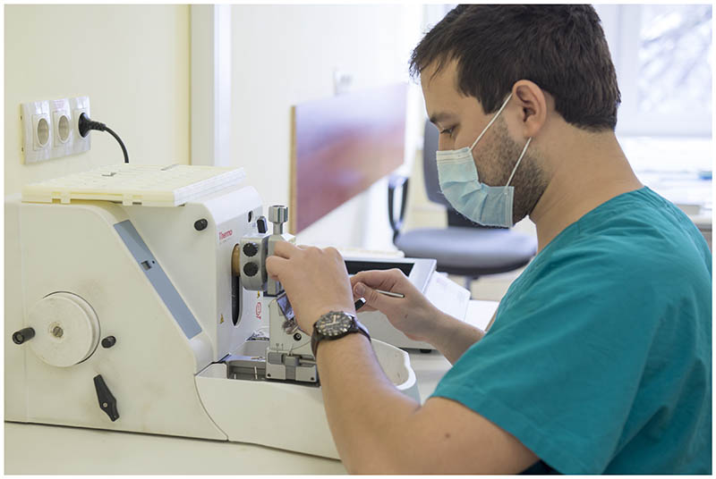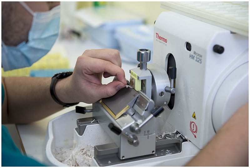 Медицинский лаборант Максим Сергеевич Куватов работает на микротоме, режет материал уже залитый в парафин