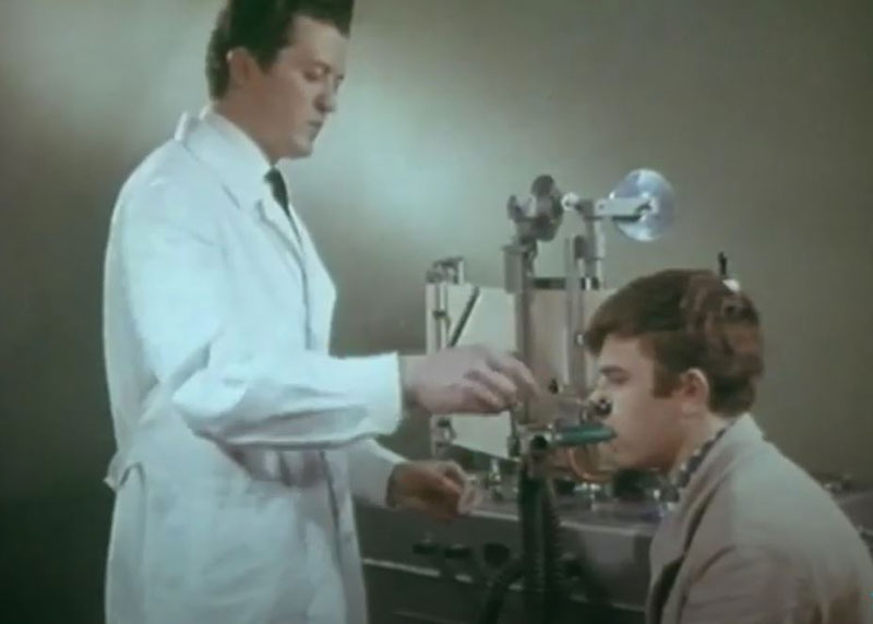 Ассистент кафедры аллергологии Анатолий Иванович Прощалыкин проводит обследование пациента с бронхиальной астмой, 70-е гг.