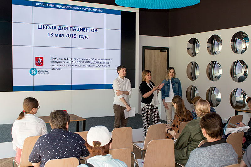 Центр считает актуальным расширение знаний пациентов о своем заболевании, одним из инструментов является проведение тематических школ. Регулярно проводятся школы для пациентов с наследственным ангиоотеком, хронической крапивницей и первичными иммунодефицитами. КАК ПРИМЕР: Неожиданно эффективными оказались обучающие мероприятия для пациентов. Так, например, встречи пациентов, страдающих НАО, с врачами способствовали сокращению сроков пребывания в стационаре этого контингента больных благодаря приобретаемым навыкам оказания самопомощи при ухудшении состояния.